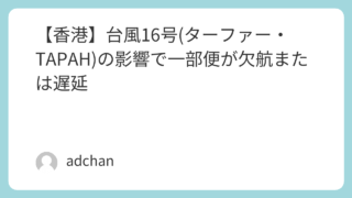 香港・マカオ 【香港】台風16号(ターファー・TAPAH)の影響で一部便が欠航または遅延 日本への直接的な影響はなしtenki.jpによると台風第16号は、7日15時現在、南シナ海にあって、北西へ毎時10kmで進んでいます。日本への影響はなさそうですが香港発着の一部の便に影響がありそうです。キャセイパシフィック航空9/8(月)に... 2025.09.07 adchan 香港・マカオ