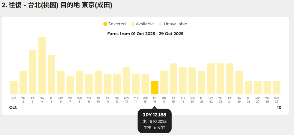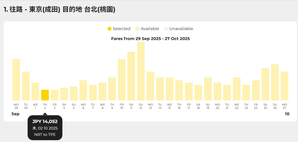9月10日 (水) 21:00に東京/成田発着と札幌/新千歳発着の台湾行きの便で調べてみました。